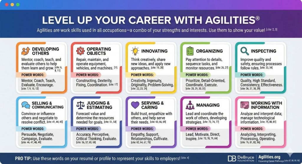 Your professional journey begins by identifying your Agilities—the essential work skills used across all occupations that represent a strategic combination of your strengths and interests. At CareerConnect, we empower you to recognize these competencies, from Innovating and Managing to Working with Information. By understanding your unique Agilities, you can clearly articulate your value to future employers, build a high-impact professional profile, and strategically activate your career pathway. Whether you excel at Developing Others, Organizing complex resources, or Selling and Communicating ideas, your Agilities provide the competitive advantage necessary to succeed in the modern workforce